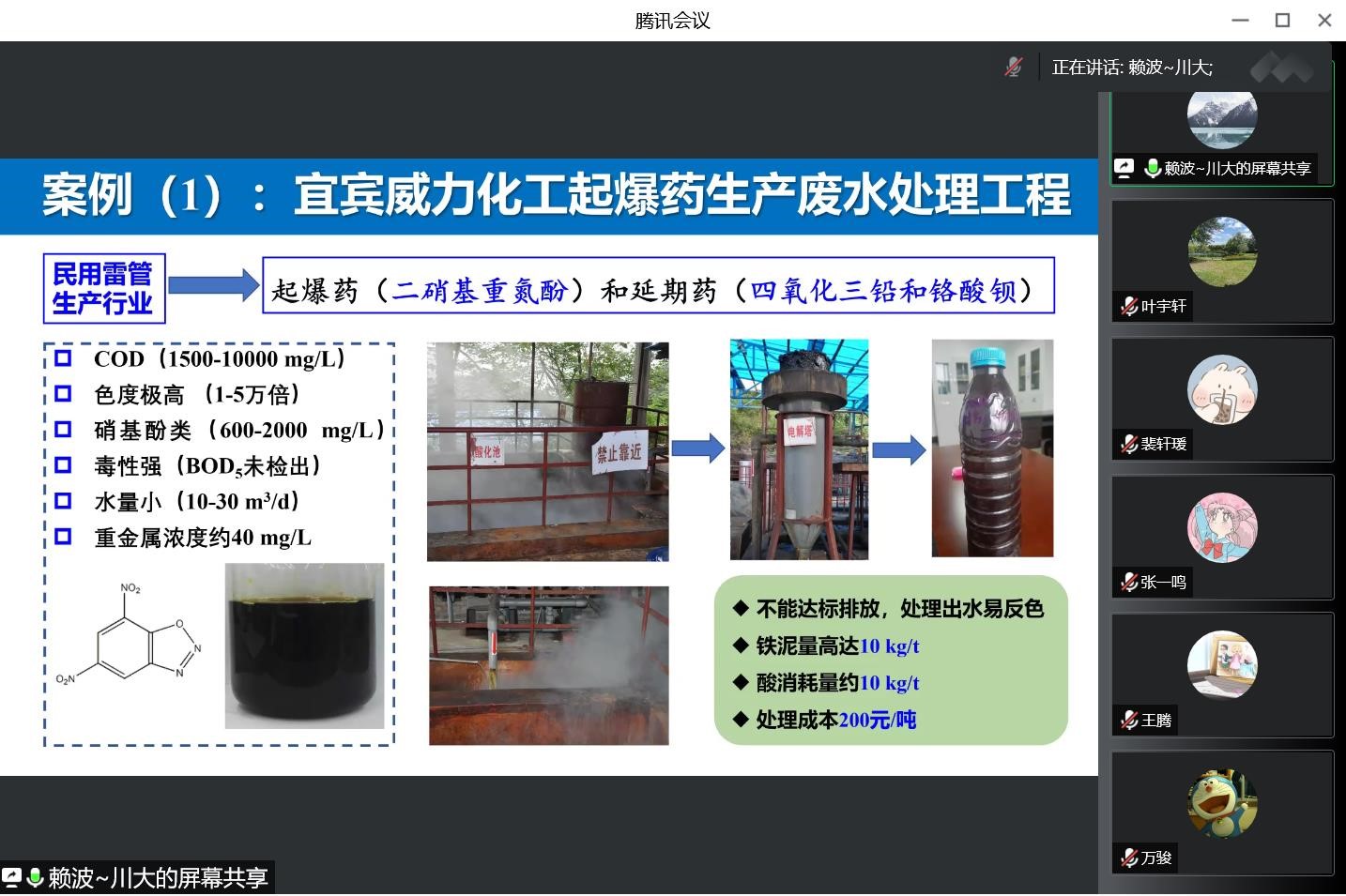 赖波教授分析了纳米零价铁在工程化应用中面临的制备成本高、反应活性过高、不易保存运输等问题,提出其核心关键点在于如何提高电子利用率。为解决该瓶颈问题,赖教授团队提出零价铁旋流体技术,强化微米零价铁在反应过程中的一系列物理化学变化,并将该技术做成配套装备用于工程实践。为便于师生理解,赖教授详细讲解了化工起爆药生产废水、火药生产废水、化工中间体生产废水以及制革高浓度有机磷鞣剂处理的实际案例,结合相关行业实际,解析了关键技术在不同废水中的应用优势及问题;对零价铁技术的应用提出了思考,对零价铁用于高附加值工业废水市场的发展前景进行展望。此外,赖教授希望老员工改变固有思维模式,能从学习知识转变为创造知识,能利用已有的知识创造新理论、新工艺、新材料、新装备,真正履行作为环保卫士的职责和义务。报告结束后,参会师生针对讲座内容进行踊跃提问,赖波教授对这些问题进行了细致解答。