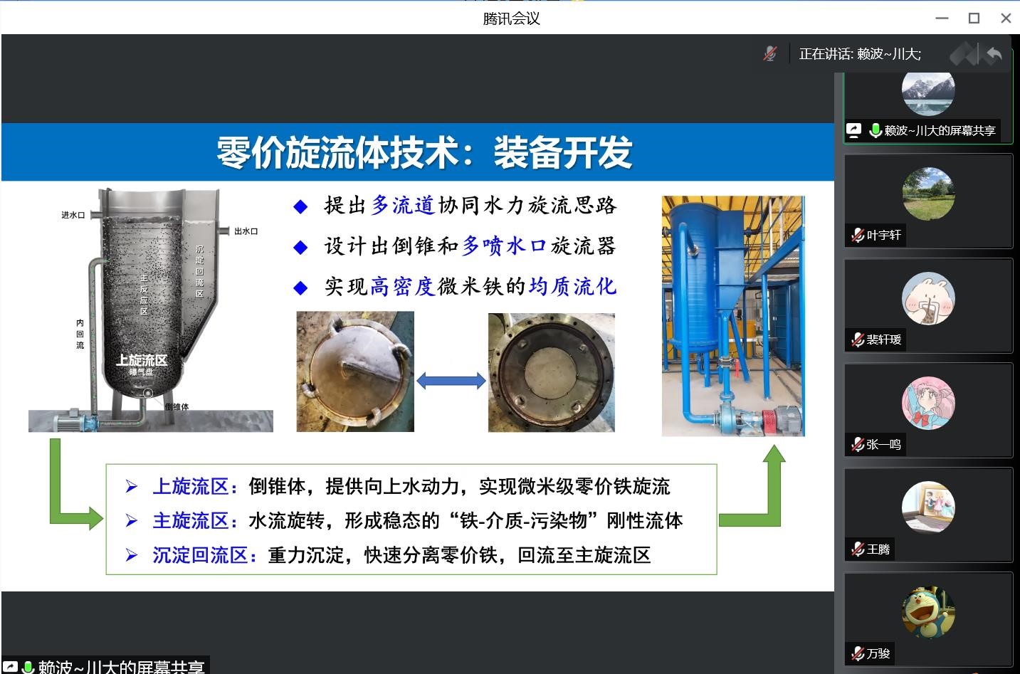 9月13日下午,环境工程公司在线上举办了公司第195期阳光论坛。本次论坛邀请了四川大学赖波教授作了题为“零价铁旋流体技术装备及工程应用”的报告。论坛由叶宇轩博士主持,公司教师和研究生参与了此次论坛。