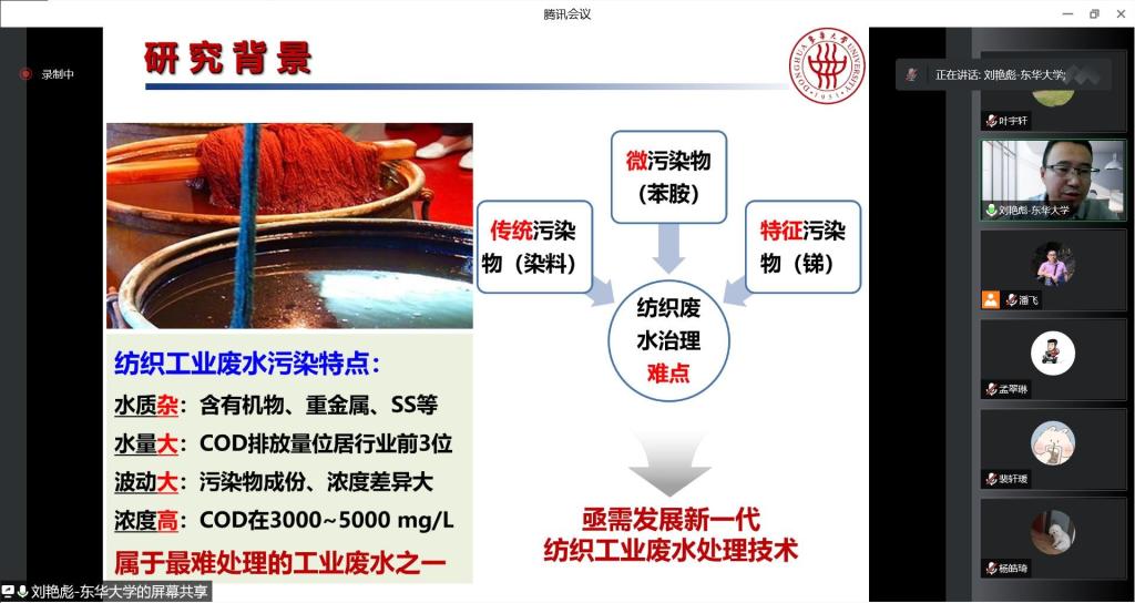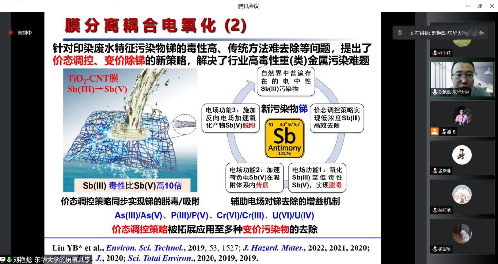 刘艳彪教授解析了印染废水存在的典型污染物种类,分析环境电化学技术在水处理过程中面临的挑战和机遇;针对纺织工业废水中的染料、微污染物以及特征污染物(锑)等,研发了新一代纳米复合导电膜材料;创新性的将膜材料与电化学技术结合,实现污染物的选择性高效去除,揭示膜分离耦合电氧化处理污染物的机理。相关工作得到了国内外知名专家的正面评价和多次引用信息。此外,刘教授还分享了做科研的经验,希望青年教师和学子多写论文,并加强与领域内知名专家的交流合作,努力提升自身的学术水平。