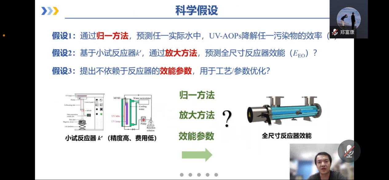 李梦凯副研究员从基于UV的高级氧化处理技术目前的研究及应用现状出发,详细介绍了目前UV-AOPs技术效能评估指标的分类方法及存在的问题。李梦凯研究团队以UV-AOPs技术中效率(反应速率常数k’)和能耗(单位电能消耗EEO)作为最基本的评估指标出发,通过模型模拟和便携测量(MS-PM)等归一法,实现UV-AOPs技术对任一实际水体,不同污染物的效率的评估;此外,又以光化学模型和自由基稳态假设模型,通过放大法,构建一系列UV-AOPs工艺的动力学模型,提出反应器速率因子的概念,因此可以有效地通过基于基准反应器的k‘,通过基准和目标反应器的反应器速率因子,来预测目标物在全尺寸反应器中的效能。报告结束后,参会师生针对讲座内容进行踊跃提问,李梦凯副研究员对这些问题进行了细致解答。