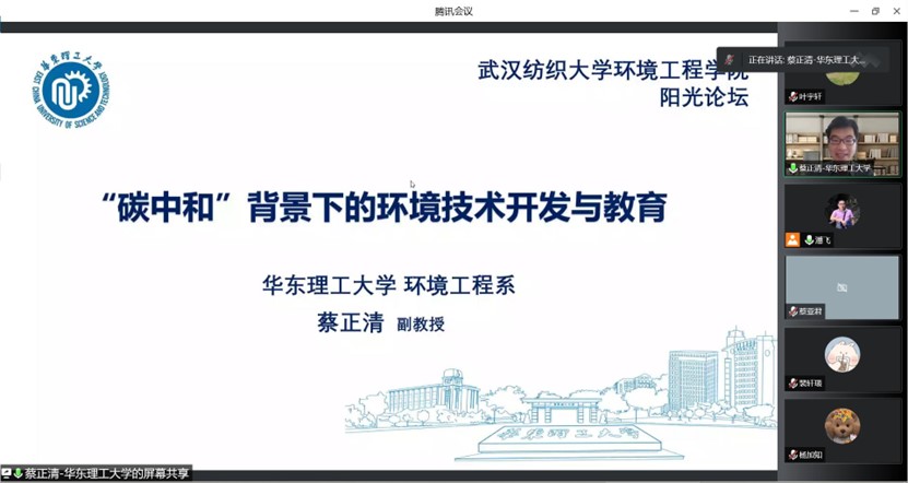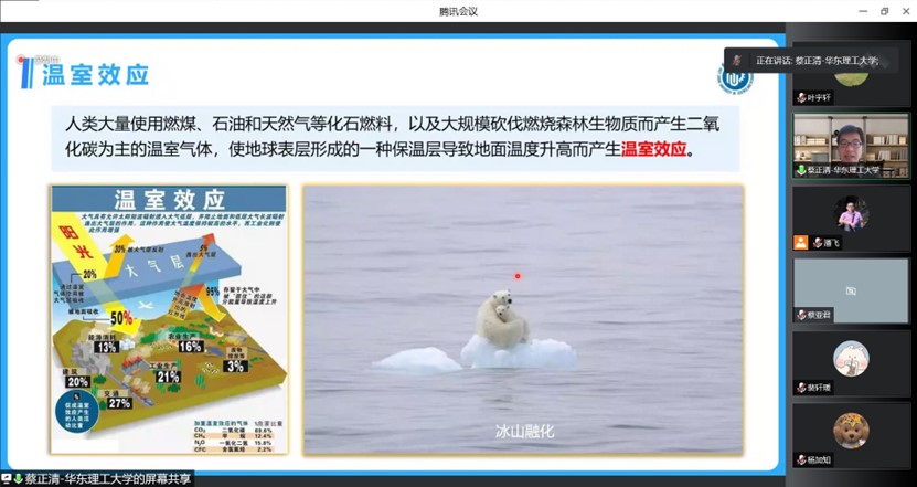 蔡正清副教授从全球变暖这一问题出发,分析了二氧化碳排放的趋势,强调了我国进行碳达峰碳中和的必要性,从碳替代、碳减排、碳封存、碳循环四个层面解析了实现碳中和的科学路径;基于目前的形势,从固废减排以及污水处理方面入手,深入展示煤气化技术、煤液化技术、可见光催化以及污水生物处理等技术在碳减排方面带来的正面效益。此外,蔡正清副教授还结合前期的研究,分享了环境领域与“双碳”背景相关的独到见解,介绍了参加学科竞赛及公司新工科建设的优秀经验,为公司师生拓展研究思路、开阔学术视野提供了帮助。报告结束后,参会师生针对讲座内容进行踊跃提问,蔡正清副教授对这些问题进行了细致解答。