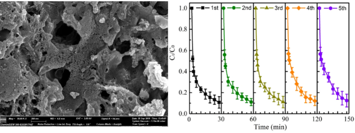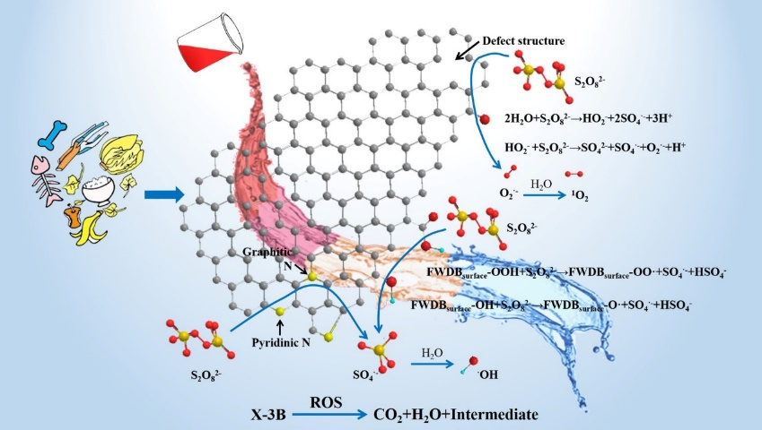 在此基础上,研究团队进一步将餐厨沼渣生物炭材料(FWDB)运用到印染废水中典型有机污染物活性艳红X-3B的氧化降解过程中,通过系统的实验研究了FWDB/PMS、FWDB/PDS体系去除X-3B的作用,并探究了FWDB对PMS、PDS所产活性氧种的影响、X-3B降解路径等关键科学问题,为印染废水中典型有机污染物的高级氧化降解工艺提供来源广泛、价格低廉的催化材料,实践“以废治废”的循环经济理念。近期该研究成果相继在Waste Management(IF=7.145)、Separation and Purification Technology (IF=7.312)刊发。