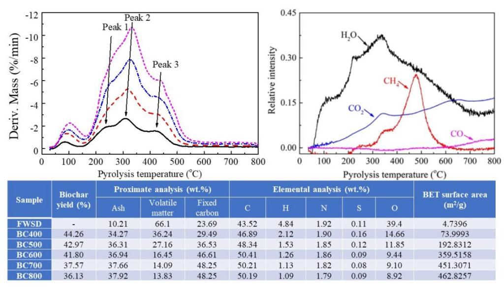 在领域TOP期刊Bioresource Technology (IF=9.642,T2)上发表了题为Preparation of biochar from food waste digestate: Pyrolysis behavior and product properties的论文,该论文第一作者为刘静欣博士,通讯作者为李进平教授,英国365集团网站为唯一完成单位。该文章对餐厨垃圾沼渣的物化性质进行了充分详尽的研究,采用Starink非等温反应模型分析了热解过程动力学,TG-FTIR-MS检测表明H2O、CO2、CO、NO、NO2、烃类等是该沼渣热解过程中释放的主要物质,对所得生物炭材料的多维度的分析表征显示,该材料具有丰富的孔道结构和表面官能团,水溶性较低,材料特性受热解温度影响很大,此外,该材料继承了餐厨垃圾重金属含量低、Ca/N/P含量高的特点。本项研究提供了大量的基础数据,有助于提升餐厨垃圾厌氧发酵副产品再利用价值,促进沼气工程的推广与发展。