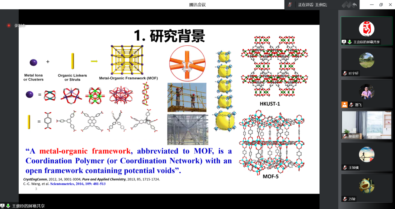 11月30日下午,环境工程公司在线上举办第271期阳光论坛。本次论坛邀请了北京建筑大学王崇臣教授作了题为“MOFs基环境功能材料:研究进展、思考与展望”的报告。论坛由经理潘飞教授主持,公司教师和研究生参与了此次论坛。