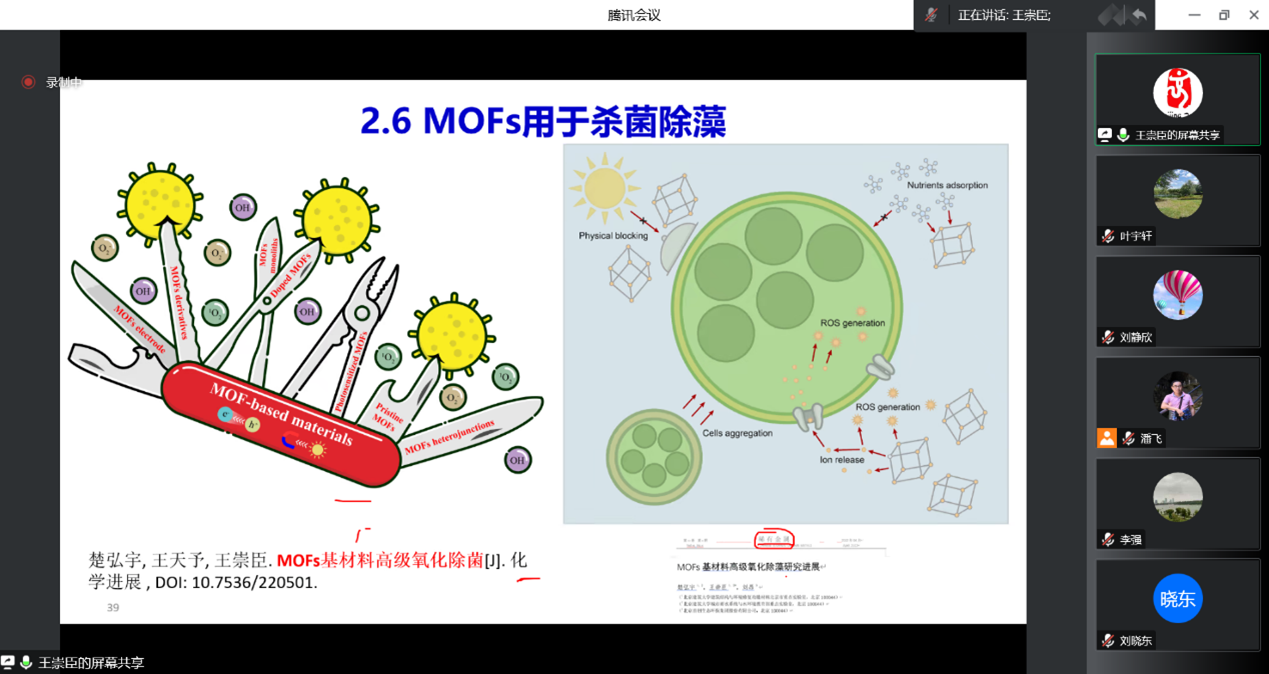 王崇臣教授从MOFs材料的研究背景、研究进展以及研究展望三方面展开,分析了MOFs及其衍生物、复合物作为环境功能材料在水处理过程中的关键科学问题;结合课题组的研究,介绍了MOFs环境功能材料在光催化还原Cr(VI)方面的应用,探究水中共存有机物的影响,阐明Cr(VI)还原及总Cr的去除机理;在环境催化方面,建立基于MOFs及其复合物的高级氧化体系,成功应用于水中新型污染物的去除,并通过一系列分析表征手段,识别MOFs材料活化双氧水、过硫酸盐等氧化剂的活性位点;开发多种MOFs材料,深入探究其对水体污染物的吸附特性及机理;同时,还将MOFs材料用于水体抗菌和除藻,极大扩展了该类材料的应用范围。此外,王崇臣教授结合自身科研失败的经历,鼓励青年老师和员工要善于发现科研亮点,切换科研思路,寻求突破口。