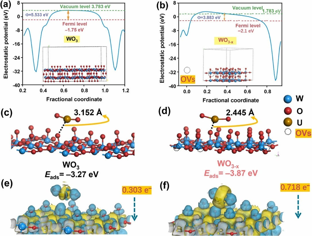 为探究U(VI)在材料上的界面反应行为,理论计算的功函数结果表明,相比于WO3(Φ= 5.533 eV),新型WO3-x(Φ= 3.883 eV)可以克服更少的能量以转移电子(图6a和6b)。吸附UO22+之后,WO3-x 中U和材料晶格O之间的键长为2.445 Å,其比WO3(3.152 Å)小,表明WO3-x对UO22+具有更高的亲和力。此外,WO3-x对UO22+的吸附能(Eads = -3.87 eV)也高于WO3(Eads = -3.27 eV),同样证实了WO3-x对UO22+的吸附能力更强。图6e和6f表明,UO22+在WO3-x上沿表面U–O方向的电子密度差(0.718 e-)大于在WO3上(0.303 e-),表明WO3-x与UO22+的键合比WO3更强。