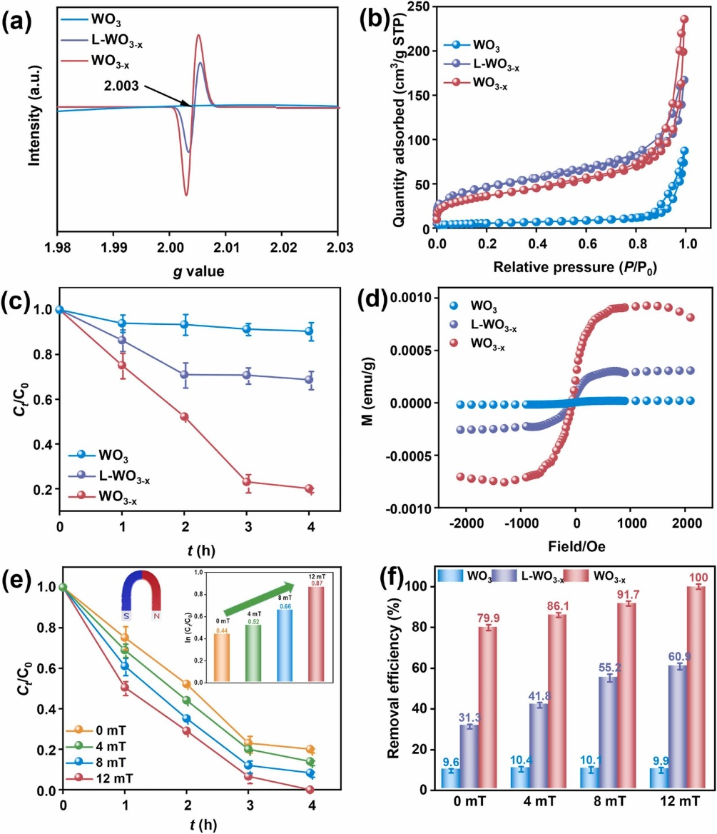 Fig. 5. (a) EPR spectra and (b) N2 adsorption-desorption curves of WO3, L-WO3-x and WO3-x; (c) U(VI) reduction kinetics by using different materials; (d) the magnetization (M-H) curves of WO3-x and WO3 at 400 K; (e) U(VI) reduction kinetics by WO3-x after the introduction of magnetic field; (f) U(VI) reduction efficiencies by using different materials after the introduction of magnetic field. (Experimental conditions: catalyst dosage = 0.2 g/L, pH = 5 ± 0.1, initial U(VI) = 10 mg/L, solar light intensity = 80 ± 5 mW/cm2, applied magnetic field = 0–12 mT).