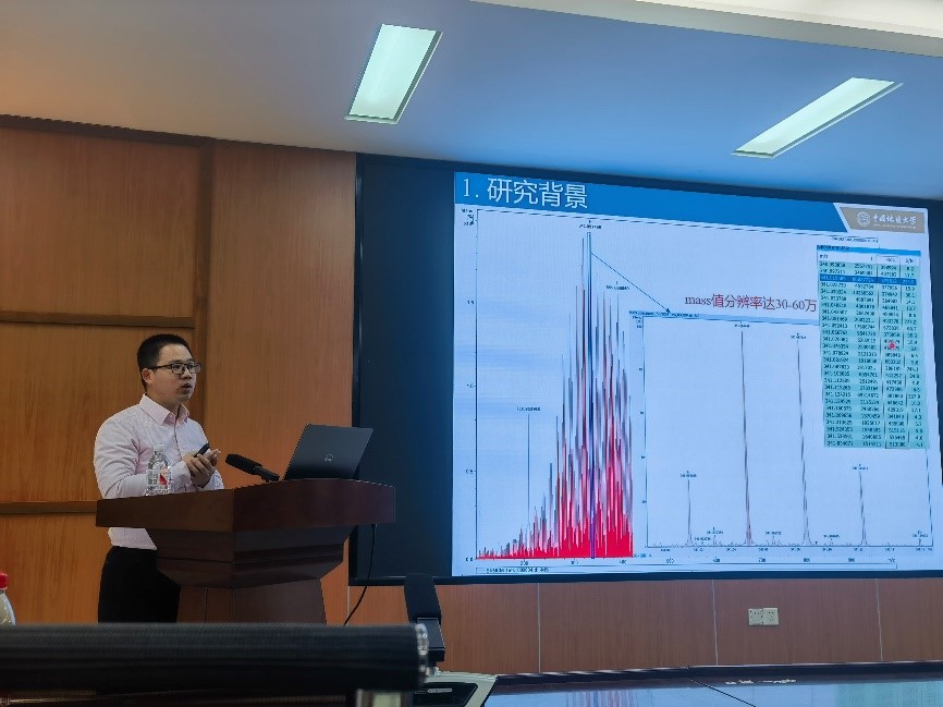 付庆龙研究员从FT-ICRMS的研究背景、FTMS Analysis平台、卤代物分析和正电荷模式加合离子分析四方面展开,分析了溶解性有机质的超高分辨质谱分析方法的关键问题。首先,介绍了傅里叶变换离子回旋共振质谱仪的优缺点;关于FT-ICRMS谱数据分析流程,高通量、自动化数据分析是其必然趋势;关于FTMSAnalysis平台的内校正,空间电荷效应(Space-to-Charge effect)导致仪器信号漂移;在卤代物分析方面,介绍了NOMDBP代码和FTMSDeu代码,这些代码在匹配分子式上具有更高的准确率,可以看出此方法能提高检查消毒副产物匹配的准确性;最后介绍了正电荷模式加合离子分析,使用同位素模式验证加合离子分子式。此外,在问答环节,付庆龙研究员还给本院本科生、研究生关于中国地质大学(武汉)考研、申博的建议。