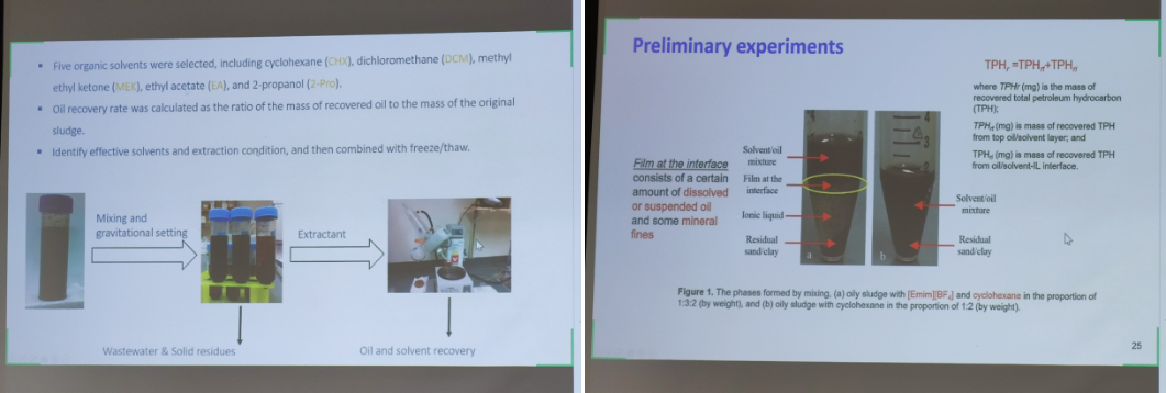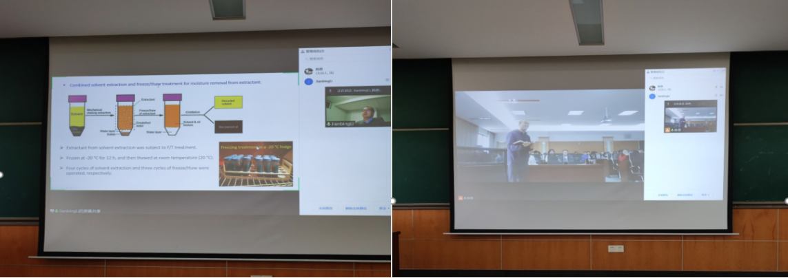李建兵教授作了题为“value added utilization of oily sludge waste”的主旨学术报告。报告紧贴国际研究前沿,首先对当今油泥处理处置手段的优缺点、发展现状、使用场景、成本等方面作了详细的综述报告,其综述成果发表在环境领域高水平期刊Journal of Hazardous Materials中。李教授强调,由于油泥的多样性,很难用单一的、固定的手段对油泥进行油回收和处理,应认识到每一种处理手段的优缺点和局限性,从而进行精准选择。接着李教授具体讲解了溶剂提取法、离子液体+溶剂法、冻融法、热解法等方法,展示了其团队在这几个方向所做的工作和取得的成果。溶剂提取法是一种传统的油提取的方式,采用相似相溶的原理用萃取溶剂对油泥中油进行溶解,达到油水分离,为了提高萃取效率,其团队采用离子液体+溶剂的方法进行改进,将离子液体与溶剂以一定比例混合后进行萃取探究,离子液体的加入大幅度提高了萃取效率,并详细介绍了操作过程中离子液体的处理方式,其相应成果发表在了期刊Energy & fuel上;冻融法是将油泥置于较低温度下进行冷冻,使油泥中分散的油品集中成一体,再通过升高温度融溶,从而达到油水分离的目的,利用加拿大室外气温较低的特点,李教授团队在该方向上做了深入的研究和工程实践应用工作;而在油泥热解方向,用油泥与木屑混合协同热解,通过调控热解条件,混合比例,获得了产量更多热值更高的油产品,并实现了对油泥中重金属进行稳定化处理的效果,热解固体产物用于污染废水中重金属铅和镉的吸附去除,对应的成果发表在环境领域TOP期刊Journal of Hazardous Materials和Chemical Engineering Journal上。李教授的讲解深入浅出,详尽易懂,现场师生互动热烈受益匪浅。