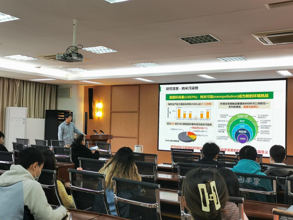 付杰教授从环境中的纳米污染物入手,详细总结了研究纳米污染物的环境行为和效应的重要科学价值,提出纳米污染物与生物絮体相互作用这一科学问题。为解析金属纳米颗粒与生物絮体相互作用机制,付杰教授课题组从金属纳米颗粒对生物絮体形成及理化性质的影响、金属纳米颗粒对絮体微生物群落的影响与作用机理、以及金属纳米颗粒在生物絮体表面的界面行为三个方面介绍了现阶段开展的工作,并分享了未来的研究方向,为公司师生拓展研究思路、开阔学术视野提供了帮助。报告结束后,参会师生针对讲座内容进行踊跃提问,付杰教授对这些问题进行了细致解答。