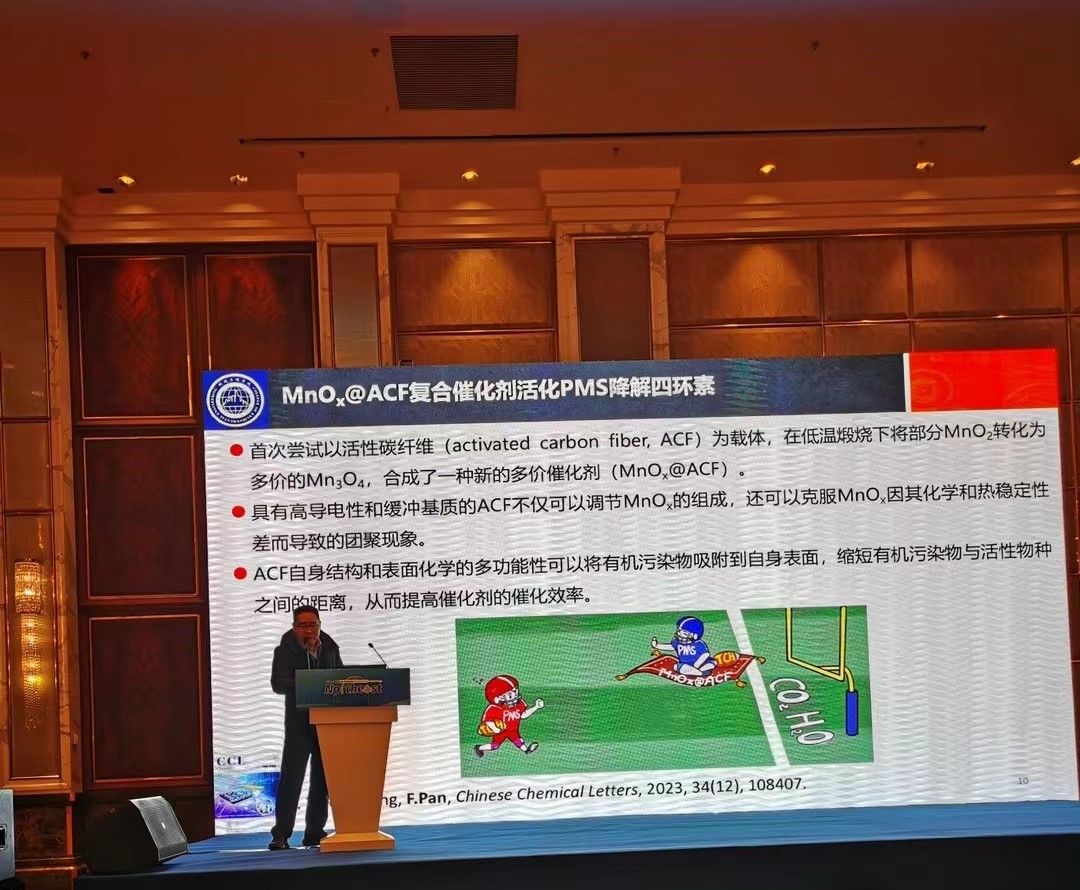 公司潘飞教授受邀在“环境功能材料”分会论坛作了题为“锰系材料激活过硫酸盐体系的构建及其机制研究”的学术报告,主要分享了近年来活性炭纤维在水处理工艺方面的研究。报告受到了在场学者的一致好评,潘飞教授还针对与会者的提问进行了细致的回答,并期待与其它机构加强学术合作。