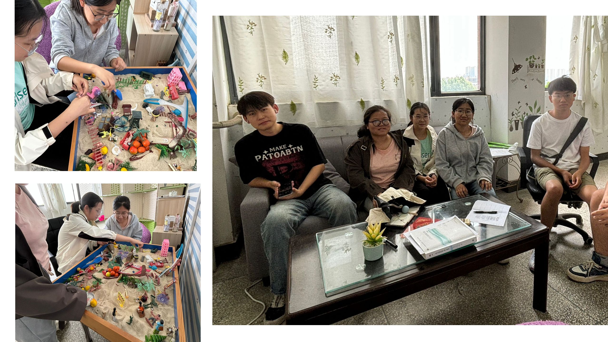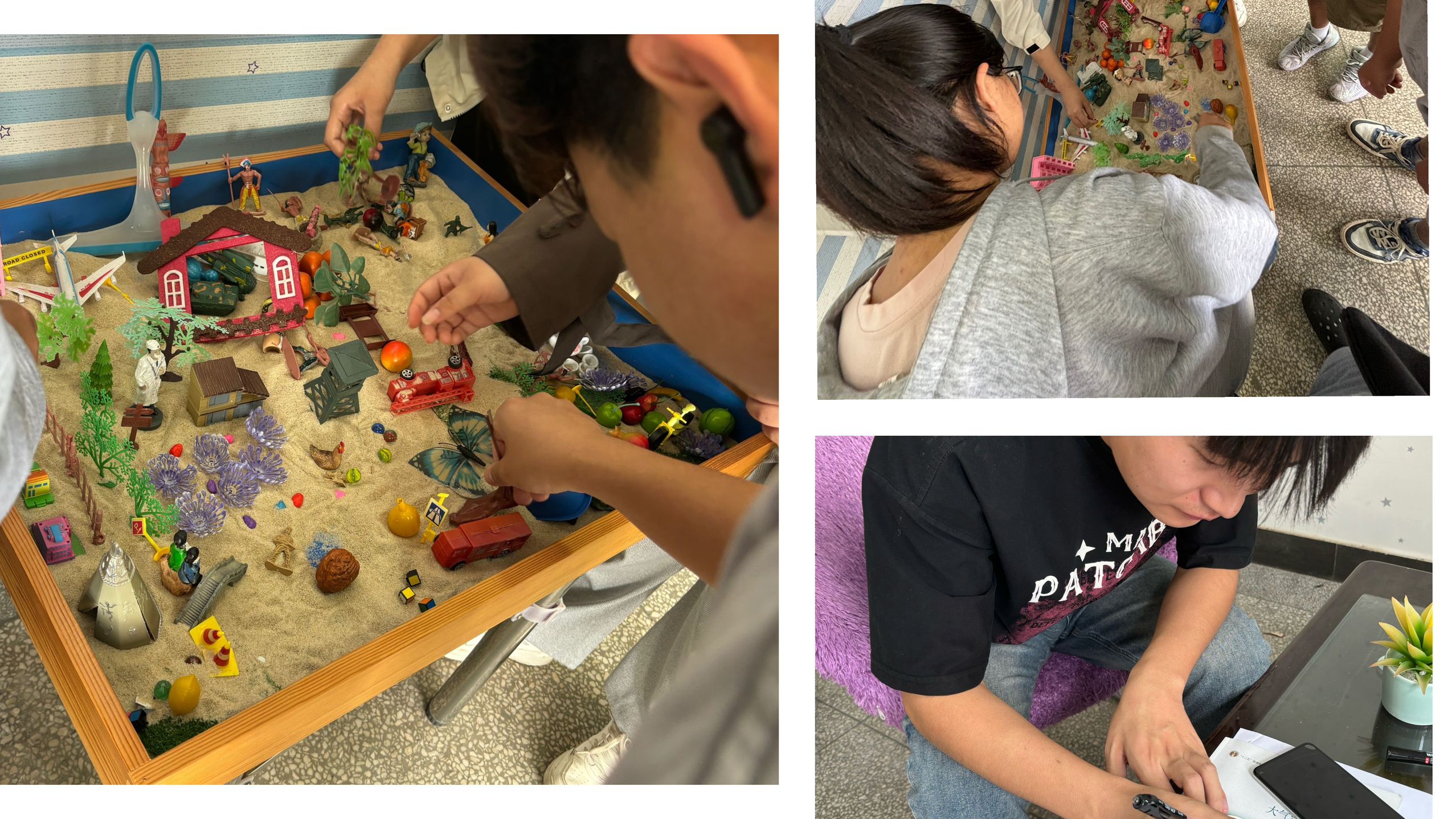 活动伊始,“沙盘解压”环节便吸引了众多同学踊跃参与。小小的沙盘成为了同学们心灵世界的投射窗口,他们用双手精心构建着属于自己的独特场景。在这一过程中,潜意识里的压力随着沙具的摆放被渐渐释放,每一次动作都仿佛是与内心深处的自己进行对话,在创造中完成了一场与心灵的深度疗愈。