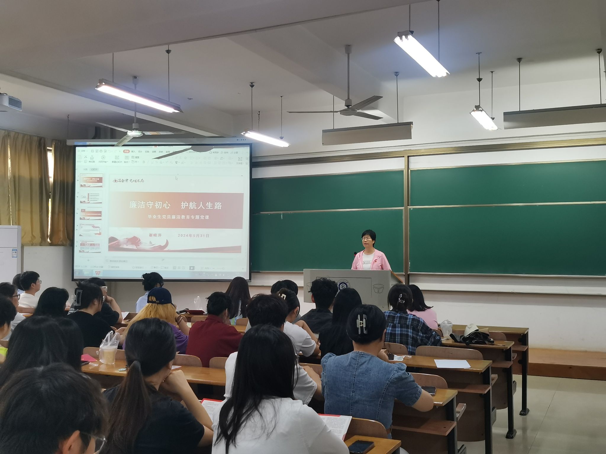 谢晓萍以《廉洁守初心,护航人生路》为题进行专题党课,对毕业生党员提出三点要求:一是站好最后一班岗,完成毕业季各项事务,发挥先锋模范作用,践行文明绿色离校;二是坚守纪律底线,在即将踏入社会之际,要牢记党规党纪,始终保持清醒的头脑和坚定的立场,做到心中有党、心中有民、心中有责、心中有戒;三是时时处处守好“廉洁关”,无论身处何种环境,都要做到清正廉洁,树立良好的个人形象,树立“一心为群众谋公事”的价值追求,在新岗位发光发热。最后,谢晓萍寄语毕业生以坚定的理想信念和扎实的专业知识,为国家的环境保护事业贡献自己的力量。