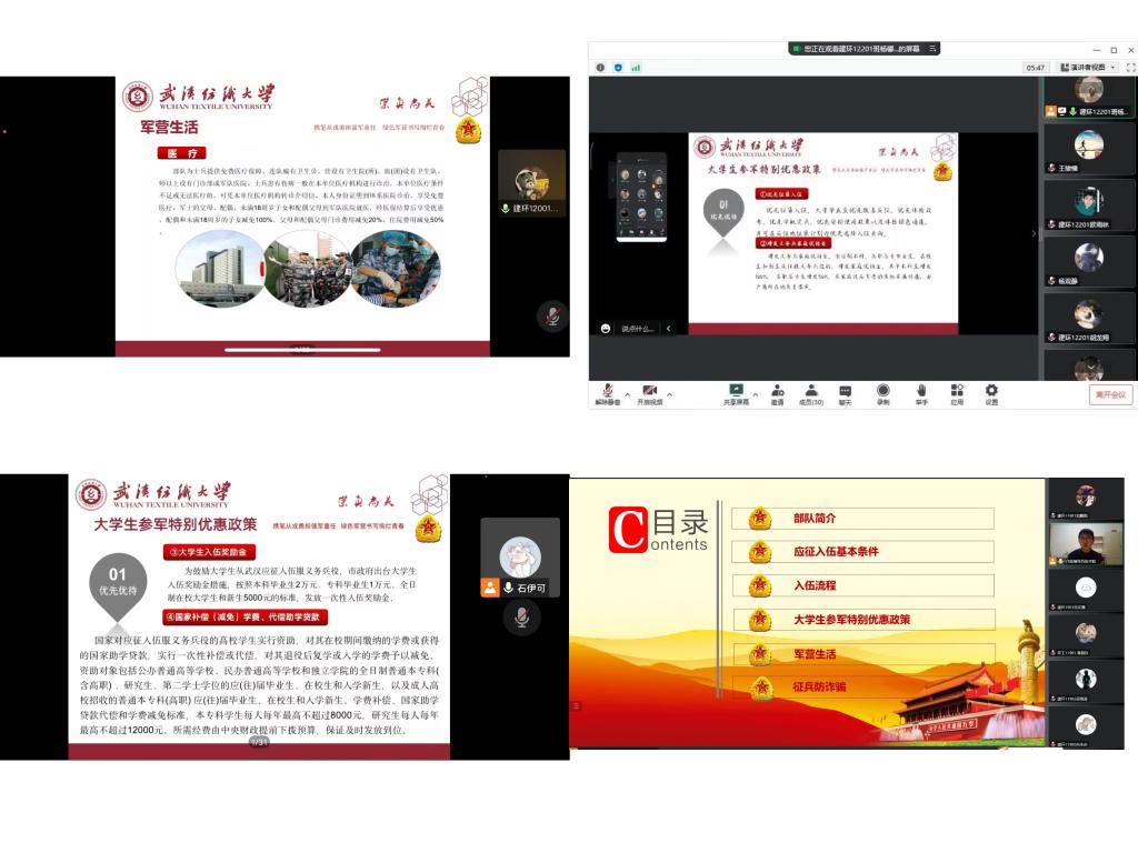 为积极响应国家和公司的号召,全面做好2023年春季老员工征兵入伍宣传动员工作,鼓励引导老员工在携笔从戎中勇担强军重任,投身绿色军营书写绚烂青春,环境公司分年级、班级召开了秋季征兵入伍主题班会,辅导员和班主任分别通过线上会议的形式进行2023年春季征兵入伍动员工作。