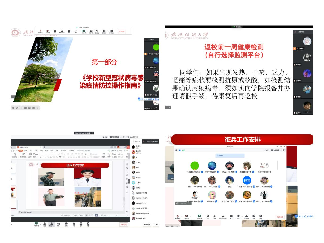 班会上,各年级辅导员带领同学们深入学习了《公司新型冠状病毒感染疫情防控操作指南》(第十版),解读了开学前后一周开展健康检测的重要意义和健康监测形式,提醒同学们每个人都是自己健康第一责任人,从饮食有节、起居有常、动静结合、心态平和四个方面,做好自身健康防护。
