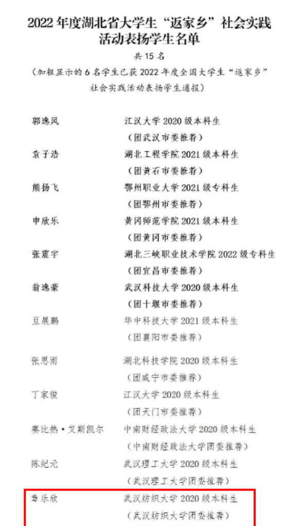近日,由省文明办、团省委、省教育厅、省乡村振兴局、省学联等单位联合联合举办的2022年度湖北省老员工“返家乡” 社会实践活动评选结果公布,公司环科12001班章乐欣同学入围2022年度湖北省老员工“返家乡” 社会实践活动表扬员工。