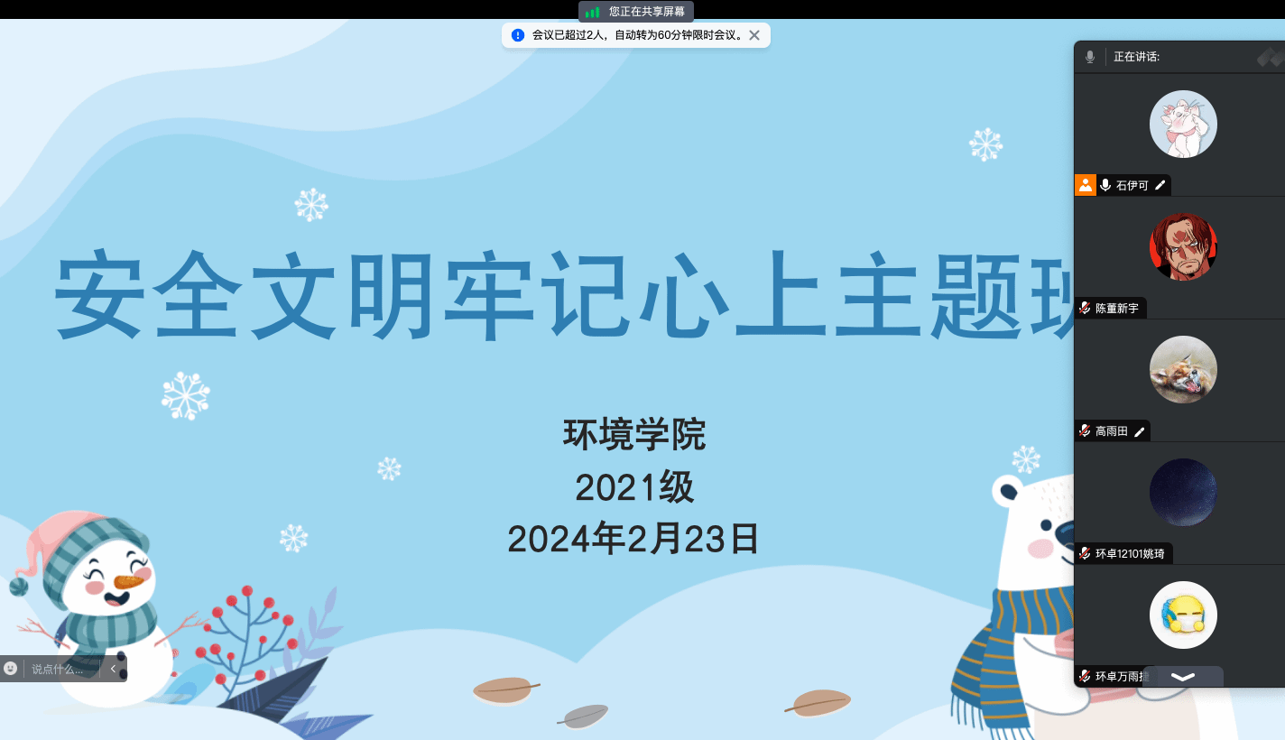 为切实做好春季开学工作,传达公司开学相关要求,了解员工返校安排和困难,确保同学们安全有序返校,开启美好新学期。2月23日,公司本科生、研究生分别开展了“安全文明牢记在心上”线上主题班会。