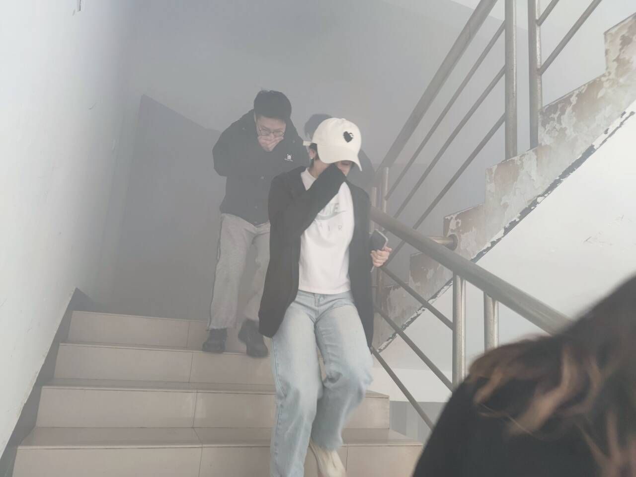 实战演练环节,在阳光校区10栋“绿芽”员工成长驿站进行。师生在听到“火警”的撤离信号后,用湿毛巾捂住口鼻,弯腰俯身,从宿舍各消防通道迅速撤离。面对模拟火情,环境、经济、会计等公司网格员、寝室长亲身体验了掌握逃生自救技巧的重要性。刘诚老师结合现场演练情况,就如何预防火灾、怎样正确报警、逃生注意事项等进行了补充强调,提醒大家正确用火用电。