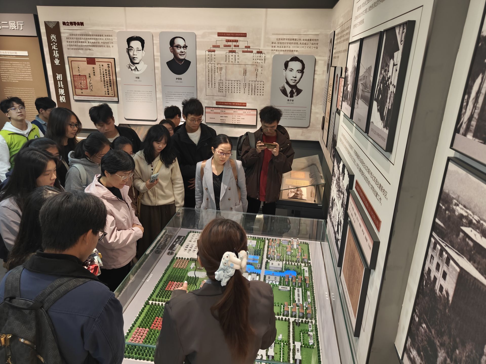 在中国地质大公司史馆,同学们沿着时间的脉络,开启了一场跨越时空的校史探索之旅。从老一辈地质工作者的坚守奉献到新一代青年学子的砥砺前行,一幅幅珍贵的老照片、一件件承载记忆的实物展品,诠释了地质科研工作者“地质报国“的家国情怀。同学们驻足凝视、认真聆听,不时交流感悟,深刻体会到要传承这份精神财富,需将其内化为砥砺前行的动力,肩负起新时代青年的使命与担当。在党建展陈区,同学们从党的光辉历程中汲取了奋进力量。