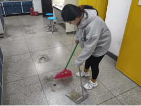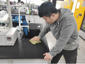 上午九点,全班员工进行分组,在老师的指导下,开始认真打扫实验室。志愿服务的工作主要包括整理实验台桌子、扫地和清细仪器。志愿者们团结协作,最终圆满的完成任务。为确保实验室的安全,我们又细致的对药品的摆放、电炉放置及门窗的关闭进行了一一的检查。