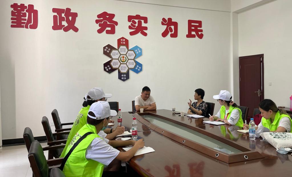小朱湾,不仅有别具荆楚风味的民宿、碧水秀竹环抱的长廊、藤萝瓜果爬满的篱墙,更有田园中流淌出的美丽乡村建设故事。团队首先来到了童周岭村村委会,对小朱湾村村主任王万里进行了访谈,了解小朱湾发展现状及存在问题。王主任对村落年轻人少、村民文化水平不高等问题作了介绍。绿芽志愿队成员表示,将结合小朱湾的实际情况开展志愿活动,帮助村落向更好的方向发展。