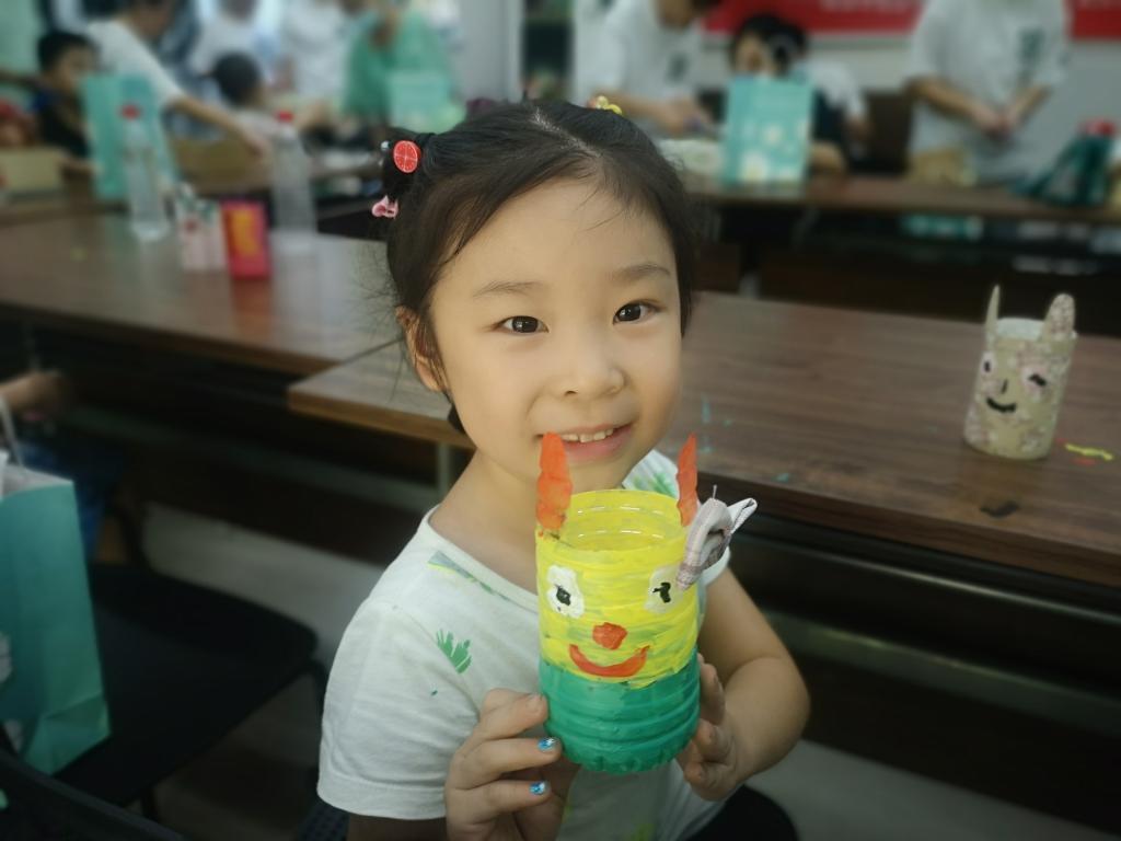 在旧物改造大变身环节,志愿者们将低碳循环理念融入亲子手作中,指导孩子们尽情发挥想象,和家长一起将废弃的饮料瓶、快递盒制成笔筒、小饰品、收纳盒等小物件。活动现场还进行了环保DIY作品展,孩子们看到各式展品后,饶有兴趣的猜起了作品改造的原材料。