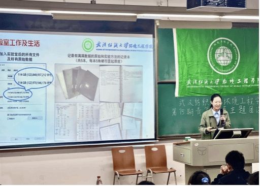 随后,2020级优秀员工代表丁艺琛进行了分享。她向学弟学弟们介绍了自己大学三年的实验室工作及科研经历,向同学们展示了自己记录有满满数据的原理和实验方法的记录本,分享了自己参加“挑战杯”赛事的经验,并给在场的同学们提出“寻己所长,不畏困难,持之以恒,奋斗到底”的建议。