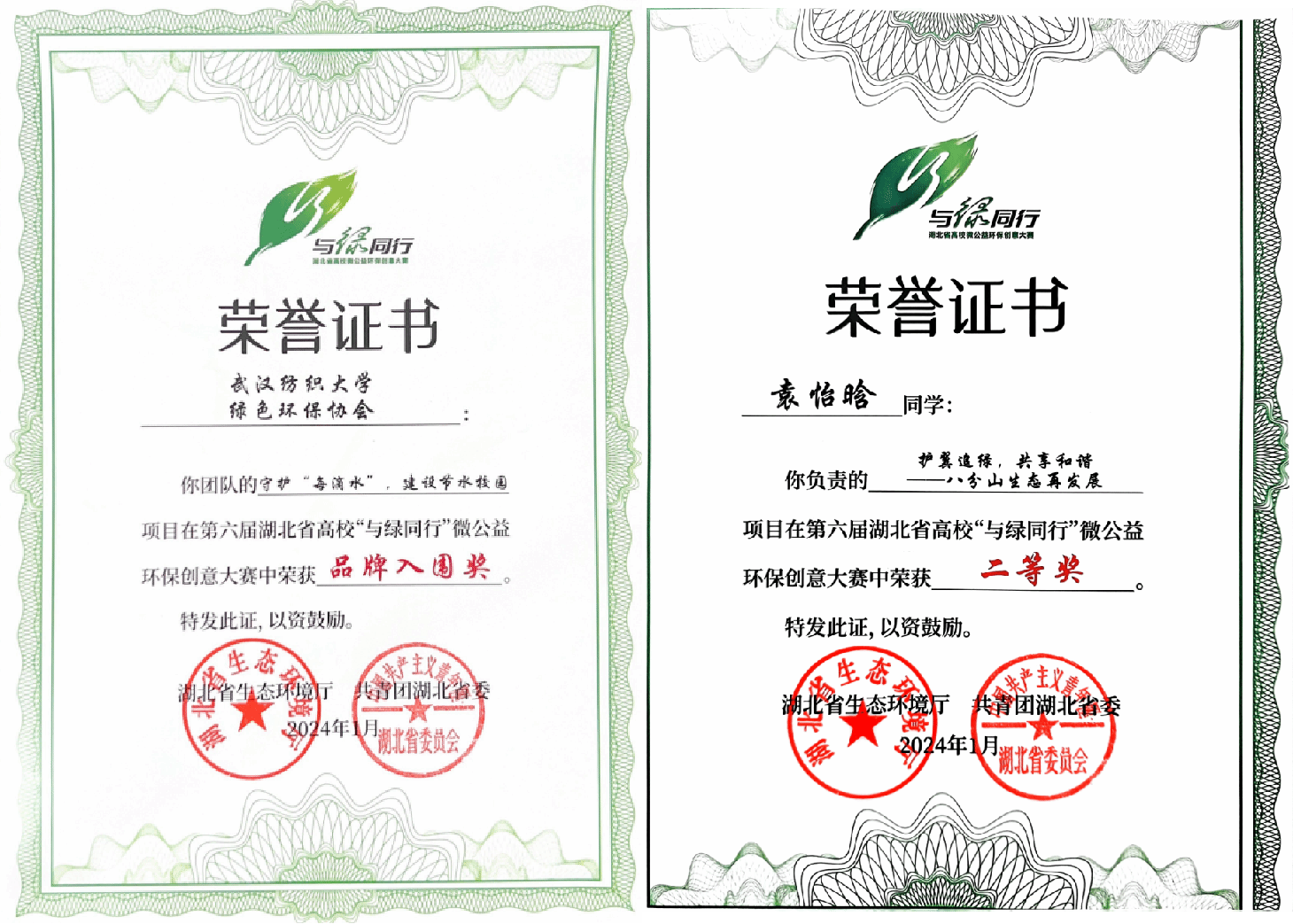 近日,第六届湖北省高校"与绿同行"微公益环保创意大赛获奖名单公布,本届共收到全省79所高校提交的403个项目方案,经过现场答辩和专家评审,公司共有3个项目获奖,分别是绿色环保协会《守护“每滴水”,建设节水校园》获品牌入围奖,英国365集团网站志愿者协会《护翼追绿,共享生态和谐》项目荣获二等奖,绿色环保协会《筑梦绿城,“纺”寻仙踪》项目获得入围奖,公司获评优秀组织单位。