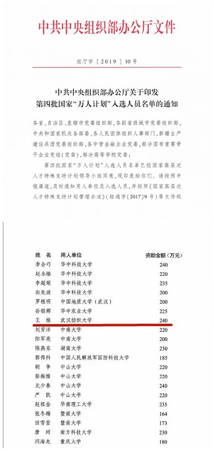 近日,中共中央组织部办公厅印发了《关于印发第四批国家“_”入选人员名单的通知》,公司王栋教授入选青年拔尖人才(自然科学类),支持经费240万,为该项目最高支持,今年湖北省属高校仅1人入选。这是公司在国家级人才项目上取得的突破性进展。